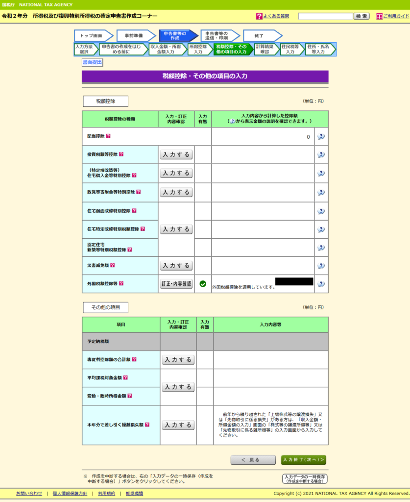 外国税額控除の入力有無にチェックが付いて、控除額が表示されていれば、「入力終了(次へ)」をクリック