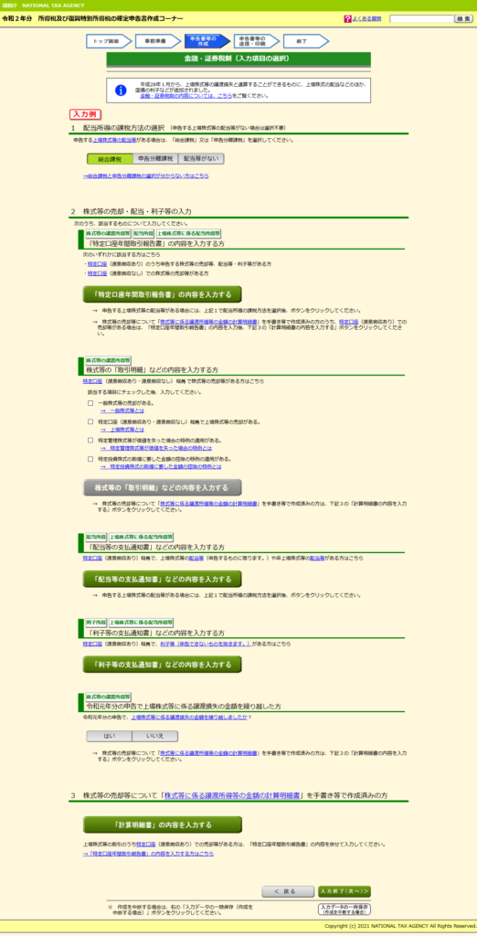 ここで入力するのは、特定口座(源泉徴収あり)で売却・配当・利子等がある場合、もしくは特定口座(源泉徴収なし)で売却がある人です
