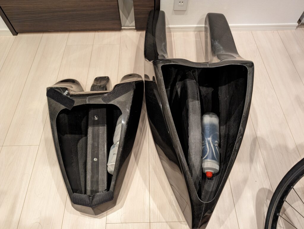 | 装着方法 | carbon carrier/fenderを使って装着(ネジ止め) | リアフォークとバッグをベルクロで接着 |