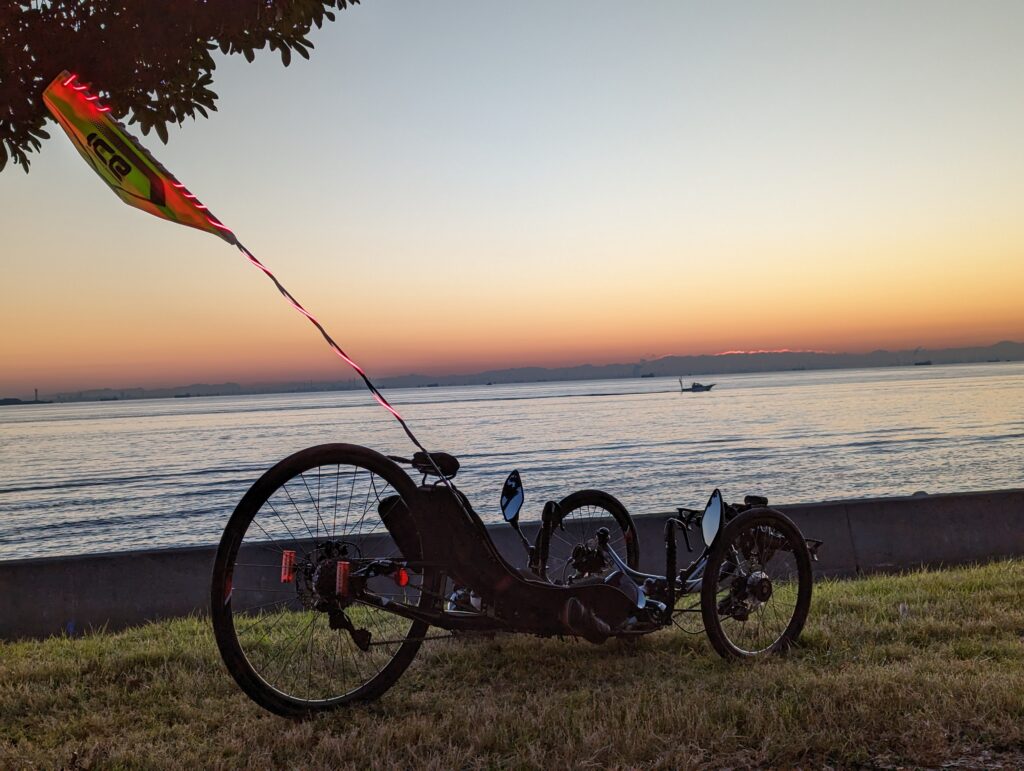 トライク、思った以上に車高が低くて、尾灯付けていても夜だと車に突っ込まれるのでは?と思ったので、目立たせるためにライトやらLEDチューブやら付けたらこんな感じに。。。